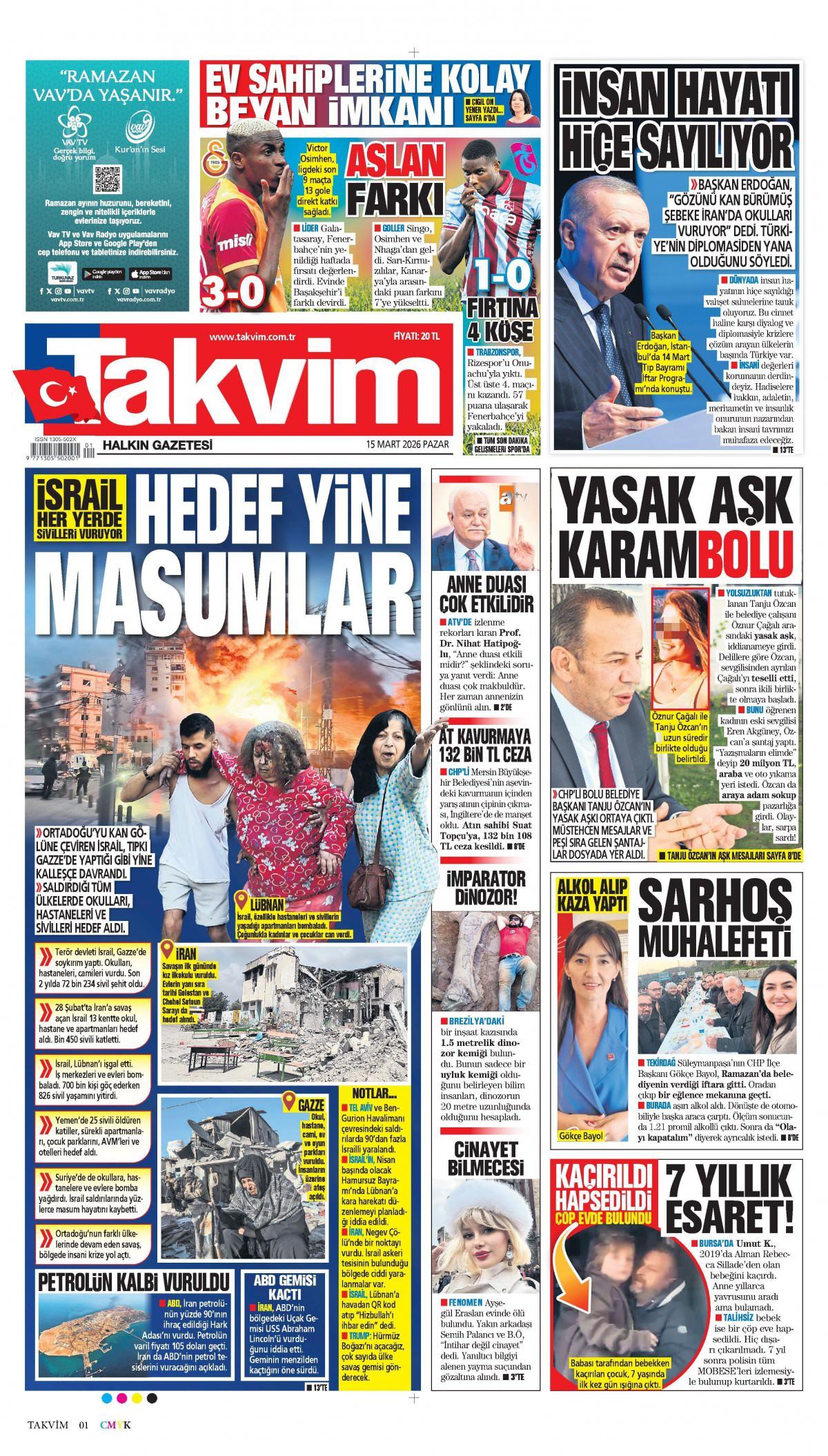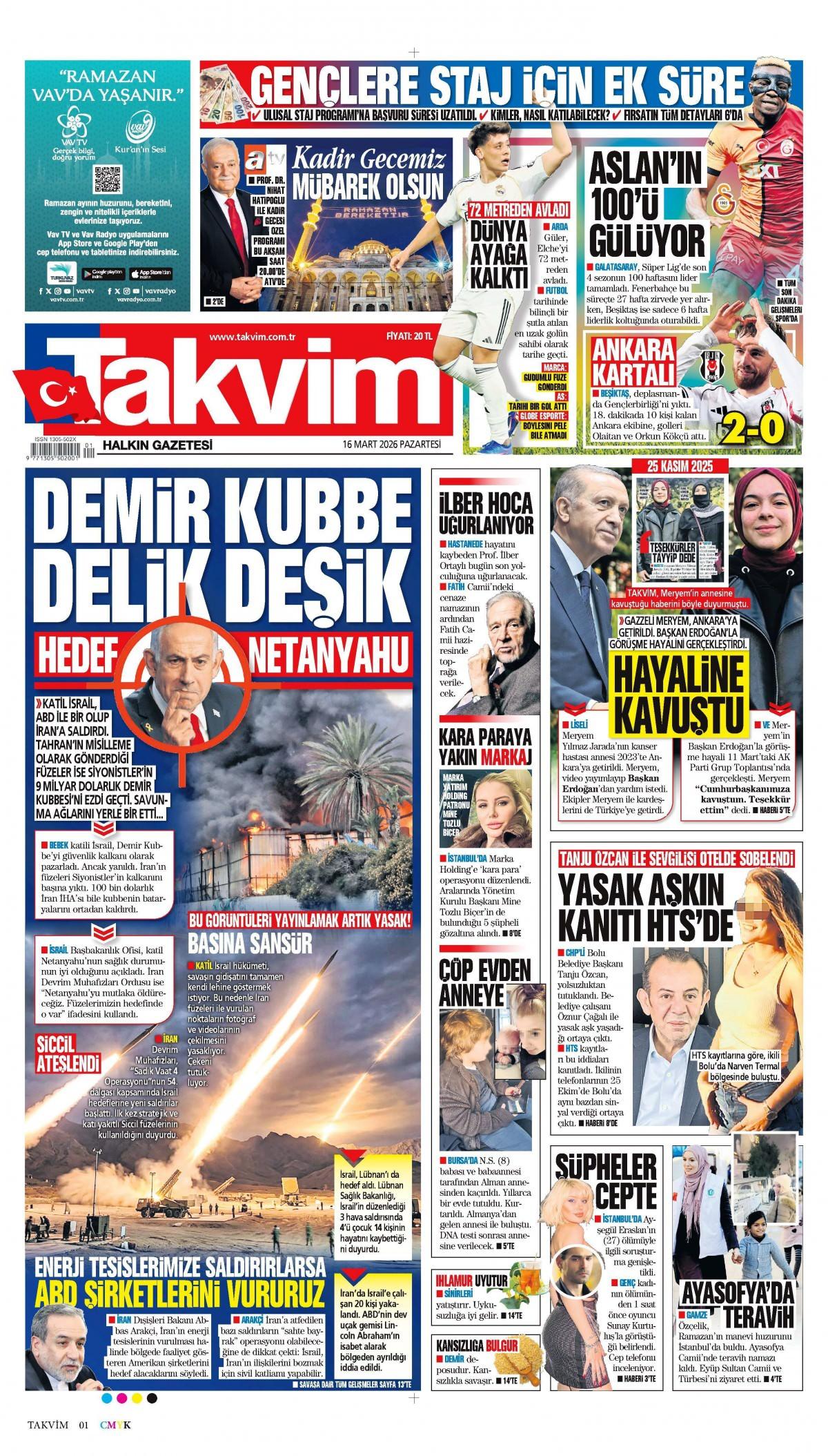 Takvim Gazetesi 16 Mart 2026 Günü Manşeti